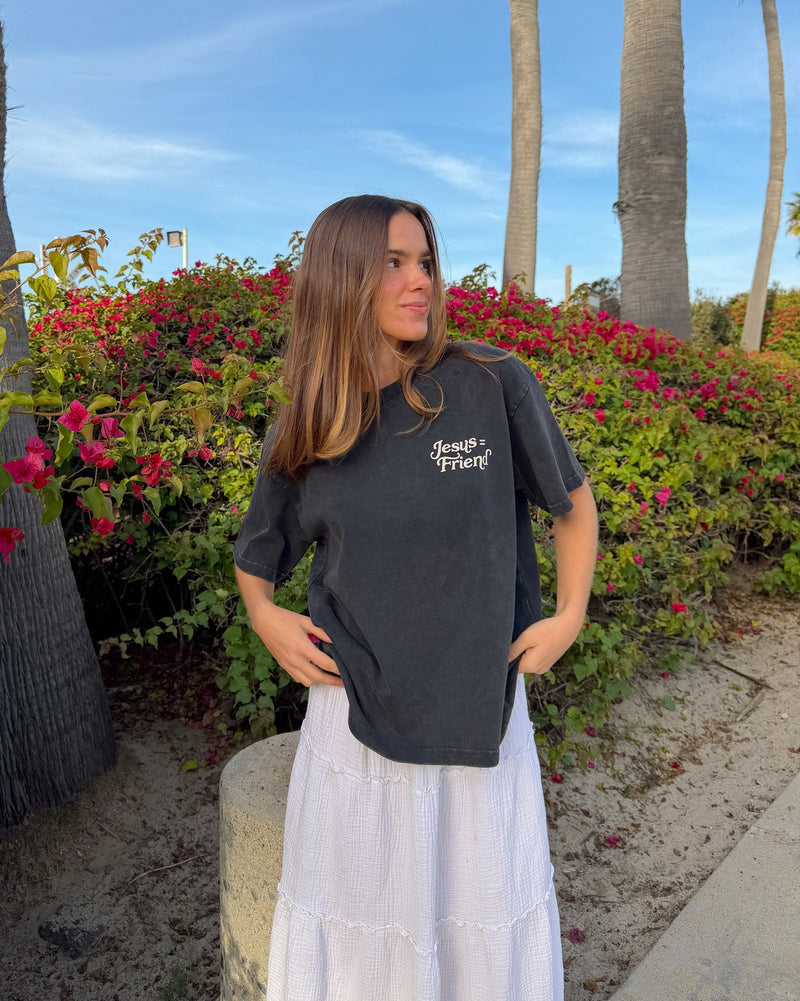 A classic cotton tee that speaks softly of faith and fellowship. The front carries a small, hand-lettered “Jesus = Friend” emblem over the heart, while the back blooms with bold vintage script reading “What A Friend We Have In Jesus.” The relaxed, boxy silhouette and crew neckline layer easily over shirts or stand alone. It’s breathable, responsibly sourced cotton with a smooth print finish that keeps the lettering crisp wash after wash. Wear it to worship nights, church picnics, or quiet mornings of prayer — it’s designed to feel lived-in and steady, like the friend it celebrates.